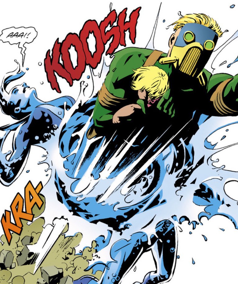 New Wave turns out almost as insane as the Joker. She drowns the toddler. Sand shatters her aquatic form – as much as you can break a female-shaped waterspout – and steals away the child.