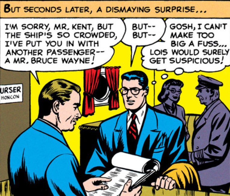 Unfortunately, as Clark discovers, the ship is overbooked and he’ll have to bunk with this Bruce Wayne chap.