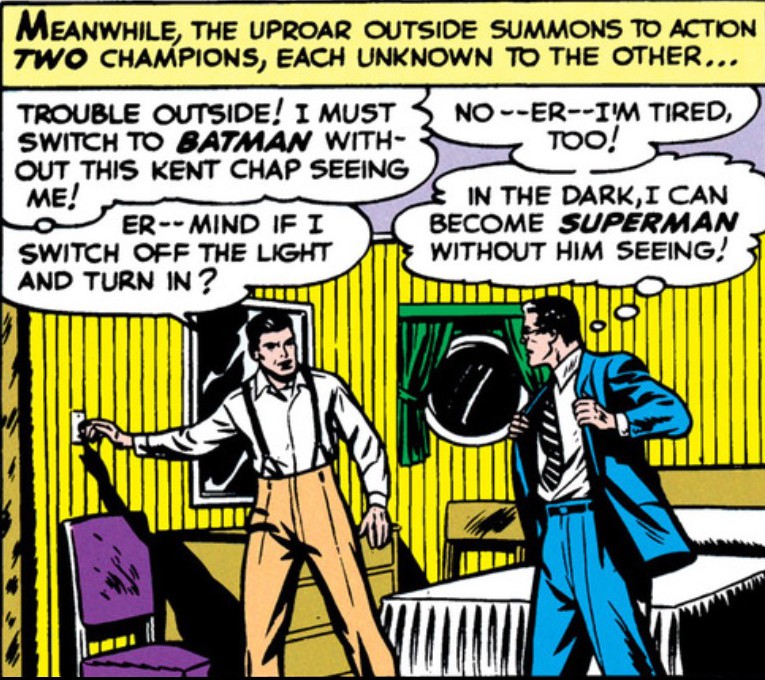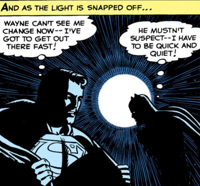 Strangers in the dark: Superman and Batman change into their costumes – vewwy quietly.