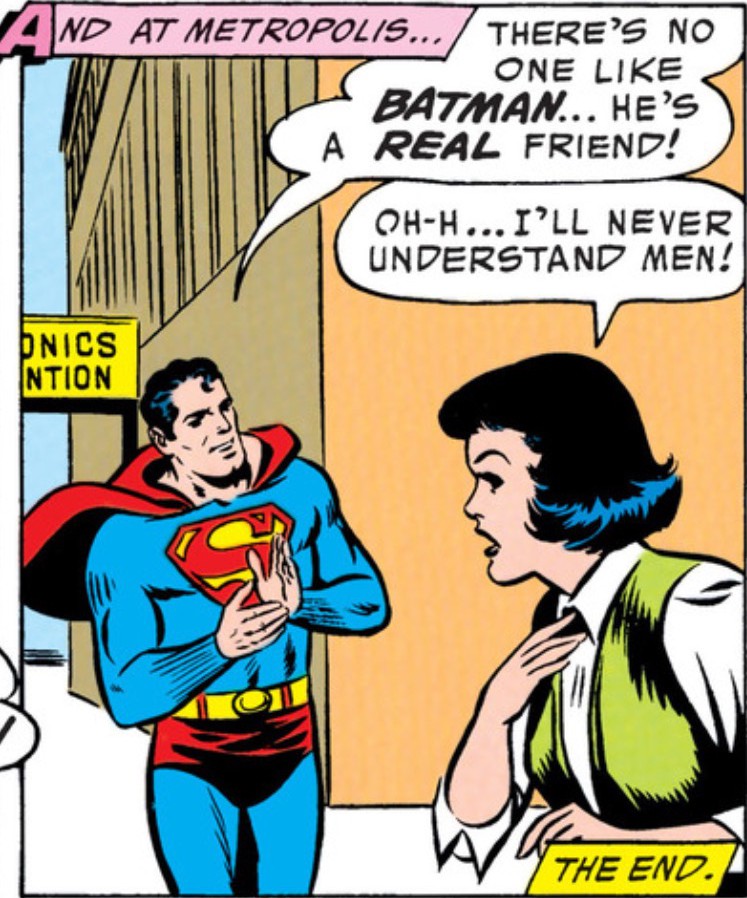 Lois overhears and decides to play them both by pretending to fall for Batman, thus prompting Superman to reveal his top-secret power: Super passive-aggressiveness. “I’ve saved you 100 times, but you seem to have forgotten about that!” he snits.