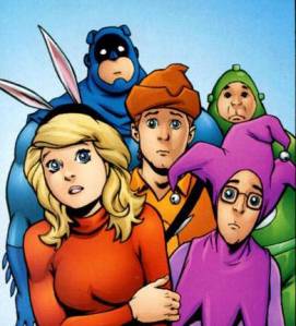 There’s Awkwardman, Blimp, Dumb Bunny, Merry Man and White Feather. This is the rarest of things, a superhero parody book, a deliberate jokefest. It smacks you over the head with a rubber chicken and scampers away, leaving you laughing.