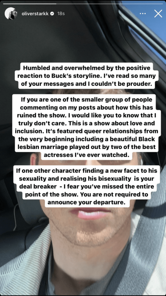 And star Oliver Stark is quite clear he loves the story and that it is long overdue. Buck has always been bisexual, it’s just that he’s now discovering it for himself. The trail of bricks – not breadcrumbs – has existed for years. You just had to have your eyes open to see it.